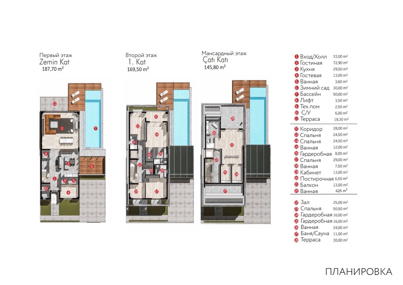 Данный проект состоит из 15 роскошных вилл в прекрасном городе Анталия. Каждая вилла предлагает планировку 6+1, общей площадью 510 квадратных метров, что обеспечивает достаточно пространства для комфортной жизни. Кроме того, каждая вилла имеет свой собственный сад площадью 30 квадратных метров, создавая уютную атмосферу и возможность для озеленения.