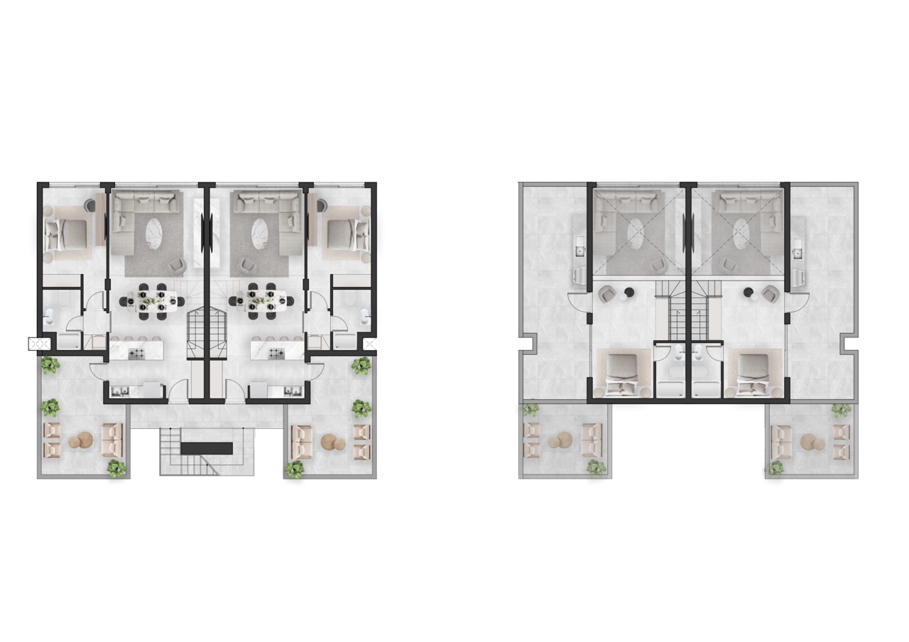 Die Wohnanlage umfasst Wohnungen mit einem und zwei Schlafzimmern sowie Duplex Loft 2+1 Wohnungen.